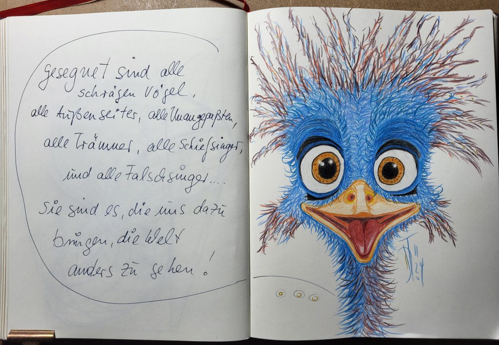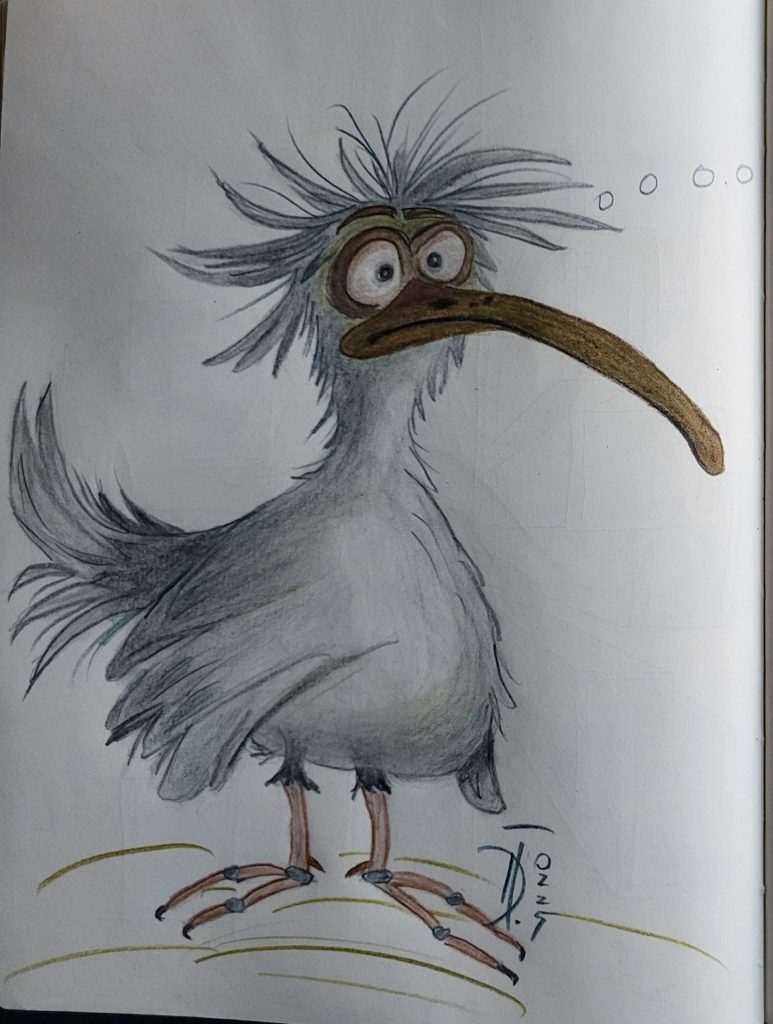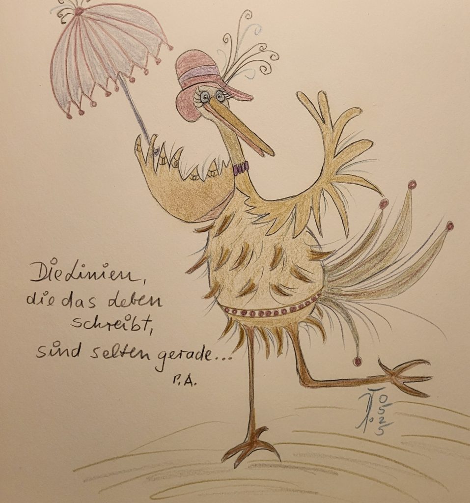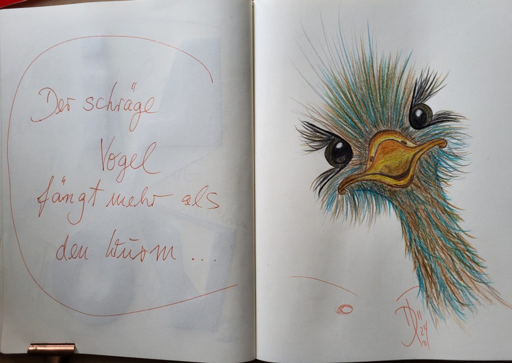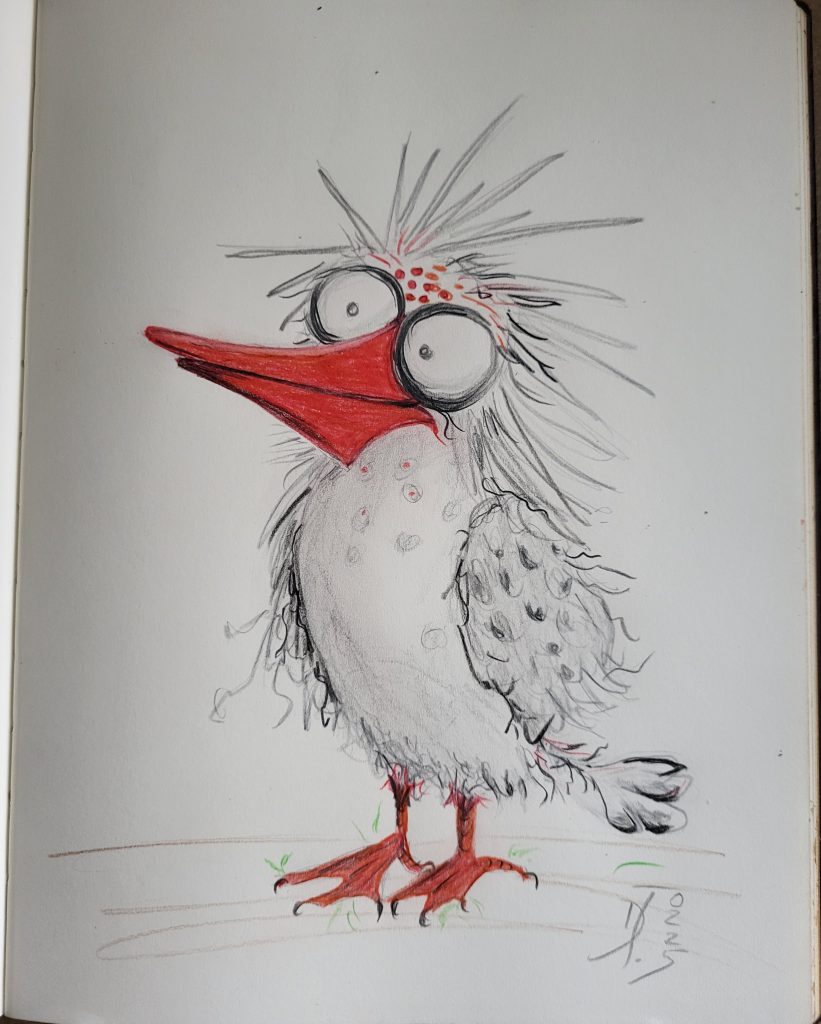 Manchmal fehlt mir die Lust zum Zeichnen, nicht weil ich es nicht liebe, sondern weil ich zu viel erwarte. Dann zeichne ich einfach einen meiner „schrägen Vögel“ oder ich überlege, worüber ich in meinen nächsten Blogbeitrag schreiben könnte.