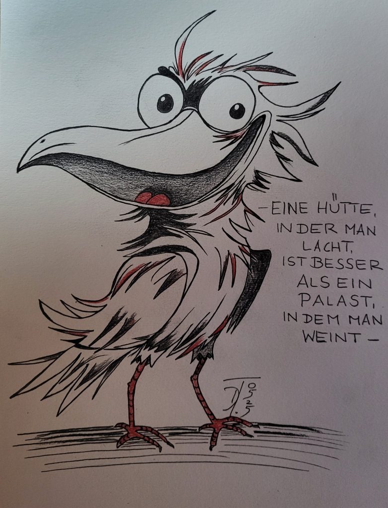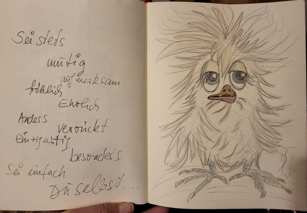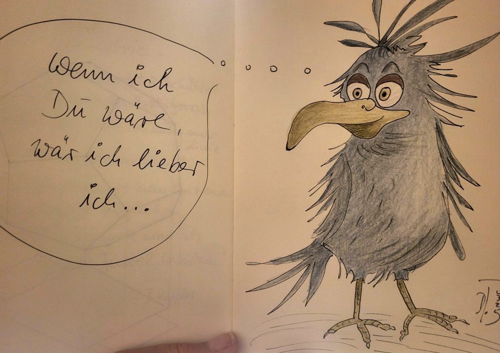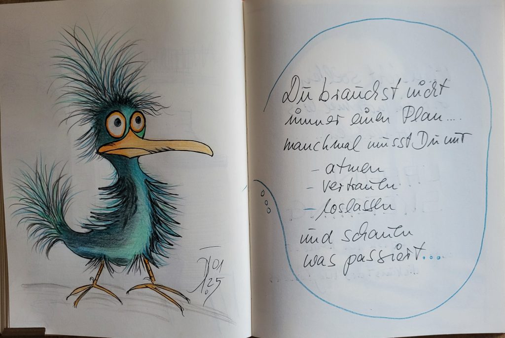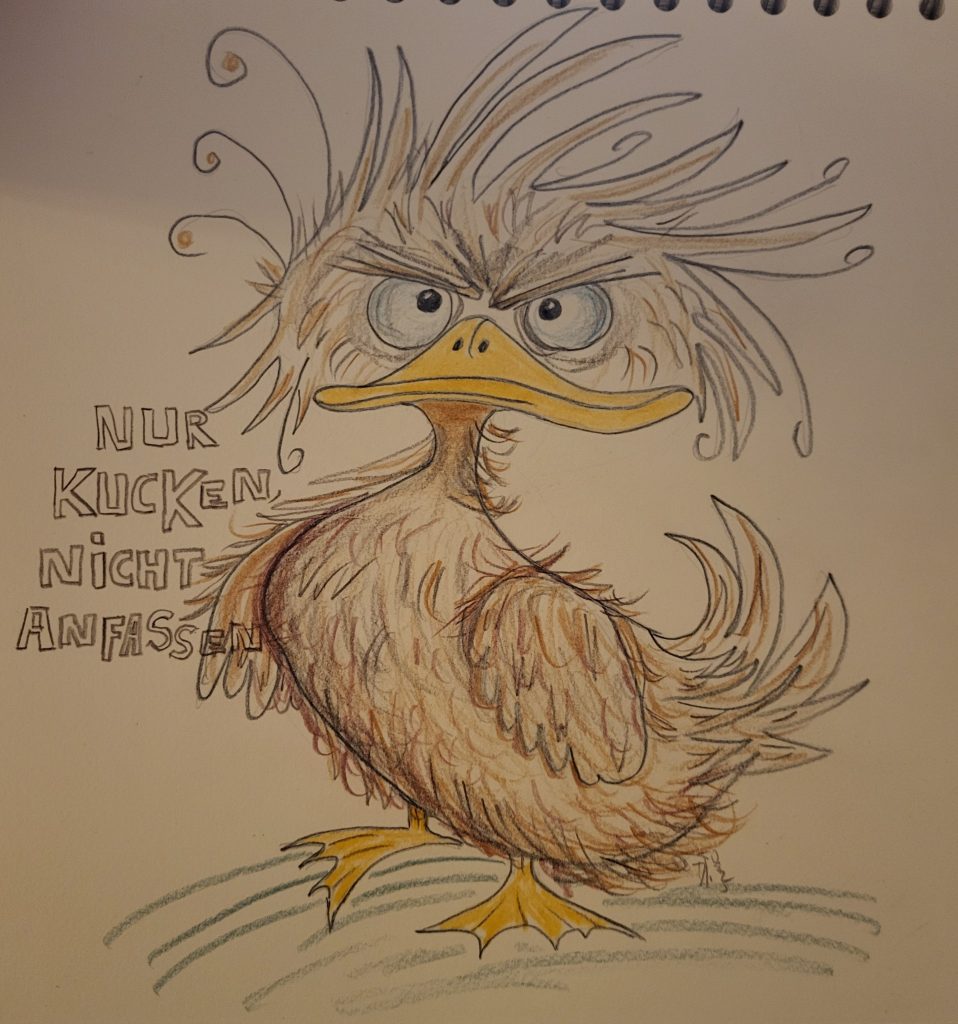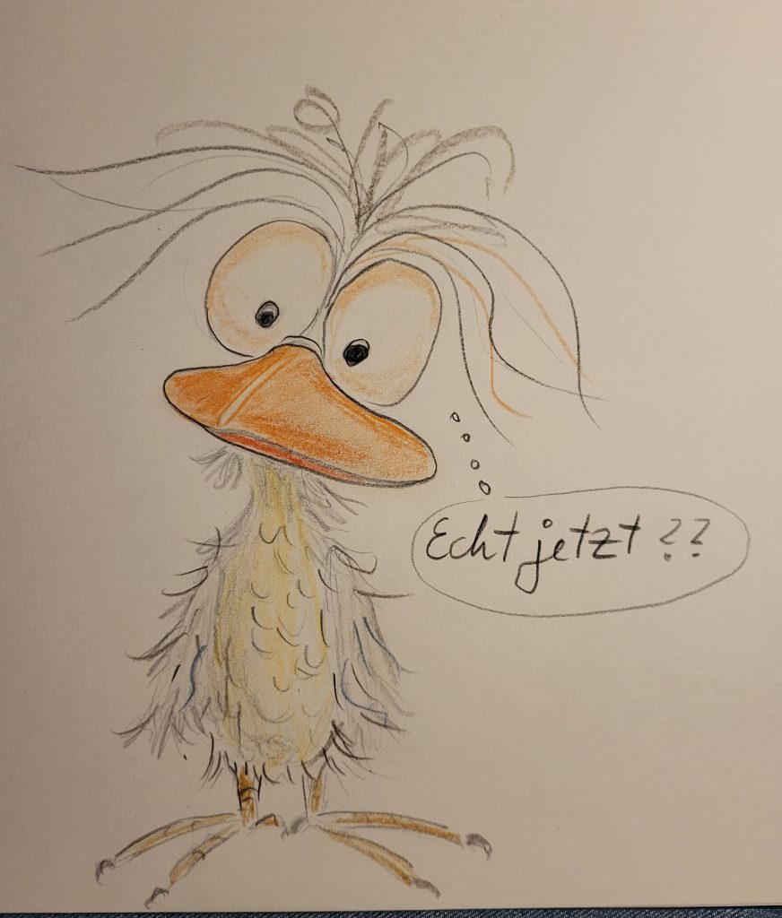 Manchmal fehlt mir die Lust zum Zeichnen, nicht weil ich es nicht liebe, sondern weil ich zu viel erwarte. Dann zeichne ich einfach einen meiner „schrägen Vögel“ oder ich überlege, worüber ich in meinen nächsten Blogbeitrag schreiben könnte.