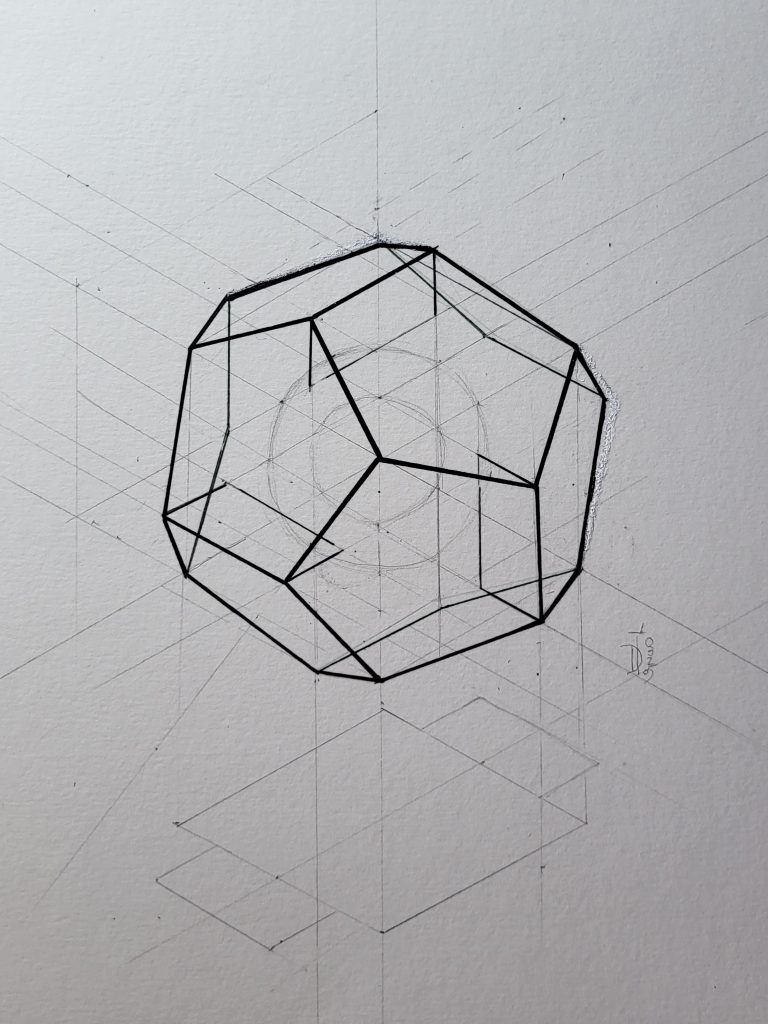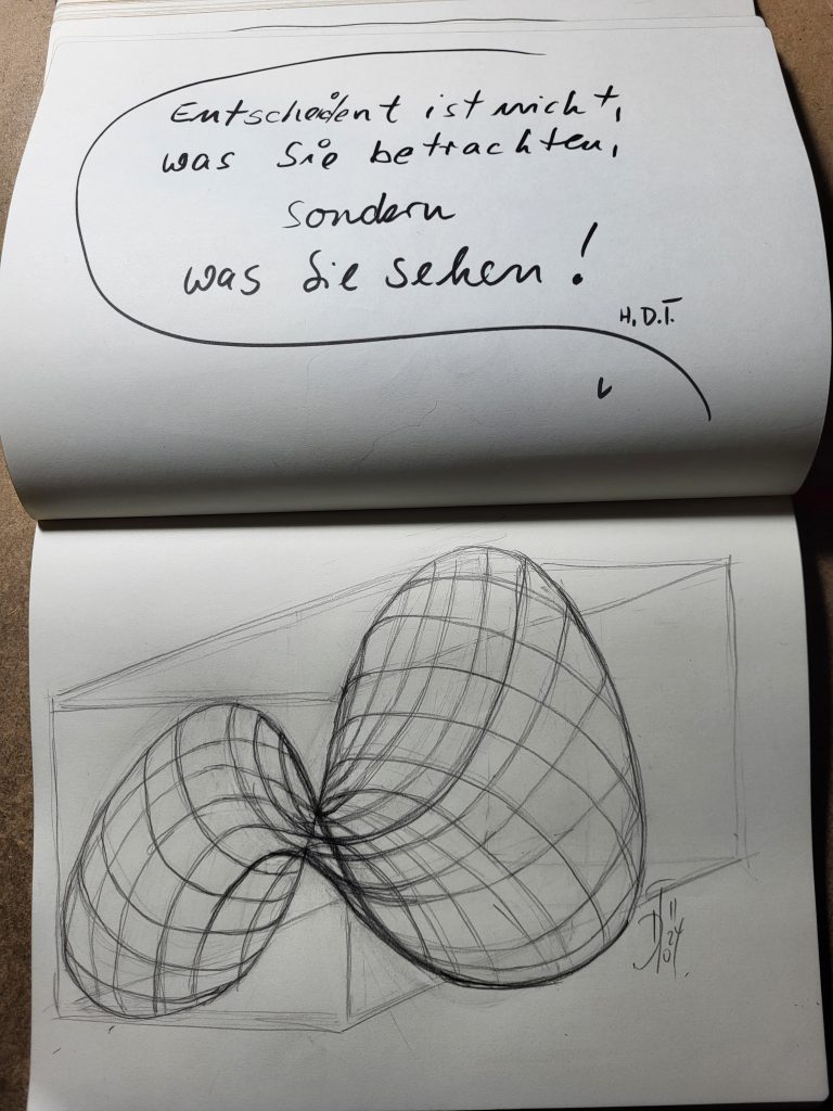 Wenn man zum Beispiel eine Spirale konstruiert, Proportionen aufbaut oder ein Polyeder zeichnet. Manchmal aber auch ganz intuitiv, wenn sich Linien zu einer Form fügen, die plötzlich erstaunlich stimmig wirkt.